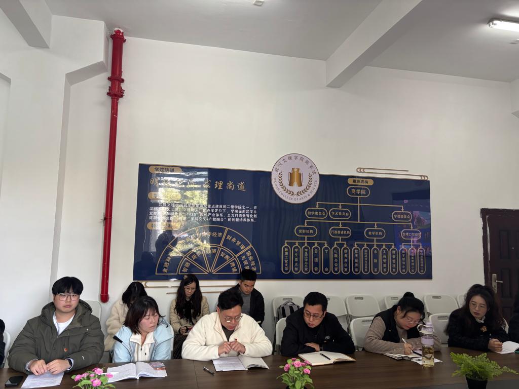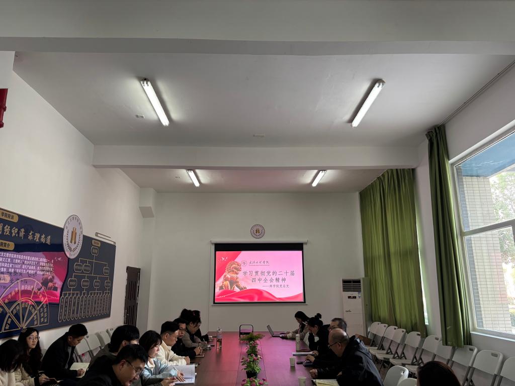 2025年11月24日,武汉文理学院商学院党总支在3-110会议室组织召开党的二十届四中全会精神专题学习会,会议由商学院党总支书记朱启贵主持,校党委书记杜永成、校长助理兼商学院院长张蕾到会指导,与全体与会人员共同深入学习领会全会精神。