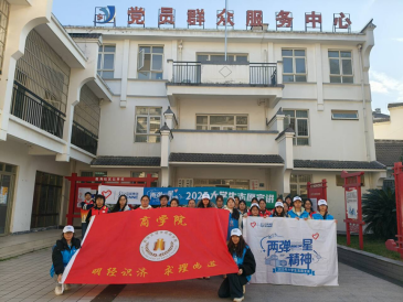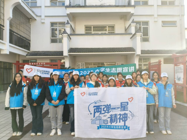 活动伊始,志愿服务队在胜海社区党员群众服务中心门前整齐列队,展开“两弹一星精神 2025年大学生志愿宣讲”主题横幅合影留念。队伍前方,商学院“”明经识济 求理尚道”的院旗迎风飘扬,展现出商院学子弘扬科学精神、勇担时代使命的坚定信念。
