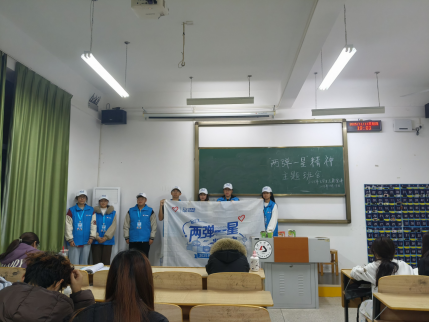 为深入弘扬爱国主义精神,引领青年学子坚定科技报国志向,2025年11月13日,武汉文理学院商学院赤商追光者志愿服务队在4-413教室组织开展“‘两弹一星’精神照亮青春路”主题班会。本次活动由学生团队自主策划实施,充分展现了商学院学子主动传承红色基因、积极传播科学知识的良好风貌。