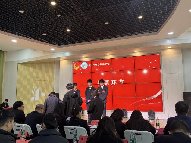投票结束后,计票人现场开启统计工作,全程公开透明。最终,大会秘书长林雪老师上台宣读选举结果:李思宇、熊伟涛、叶丽婷三位同学当选为商学院新一届学生会主席团成员!